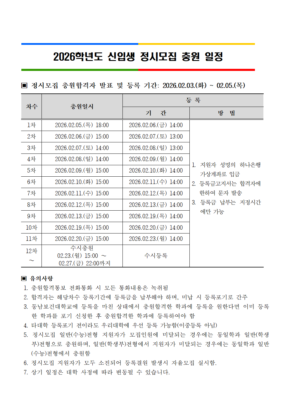 2026학년도 신입생 정시모집 충원 일정 안내
