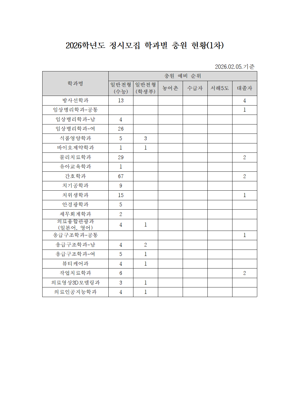 2026학년도 정시모집 학과별 충원 현황(1차)