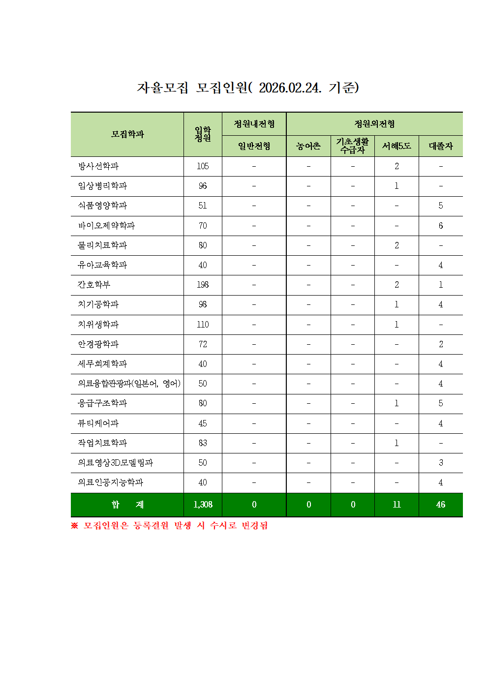 2026학년도 신입생 자율모집 인원( 2026.02.24. 기준)