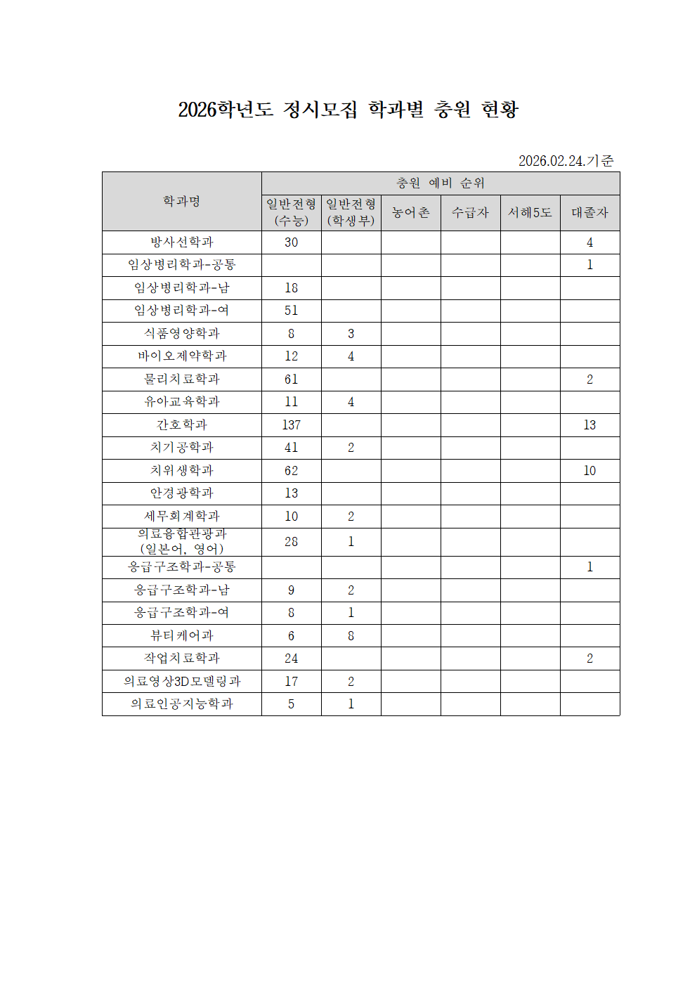 2026학년도 정시모집 학과별 충원 현황(2026.02.24. 기준)